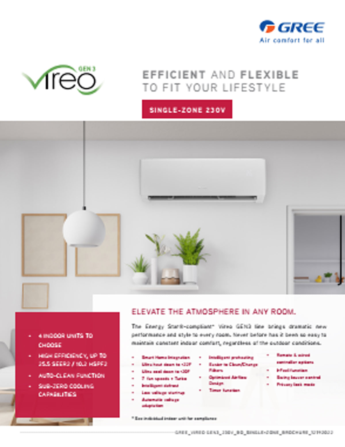 The GEN3 VIREO line brings dramatic new performance and style to every room. Never before has it been so easy to maintain constant indoor comfort, no matter the outdoor conditions.. Use and Care Manual; Instructions / Assembly; Return Policy; Specifications. Dimensions. Air handler depth (in.). GREE. Vireo Gen3 Smart Home 12,000 BTU 1 Ton.