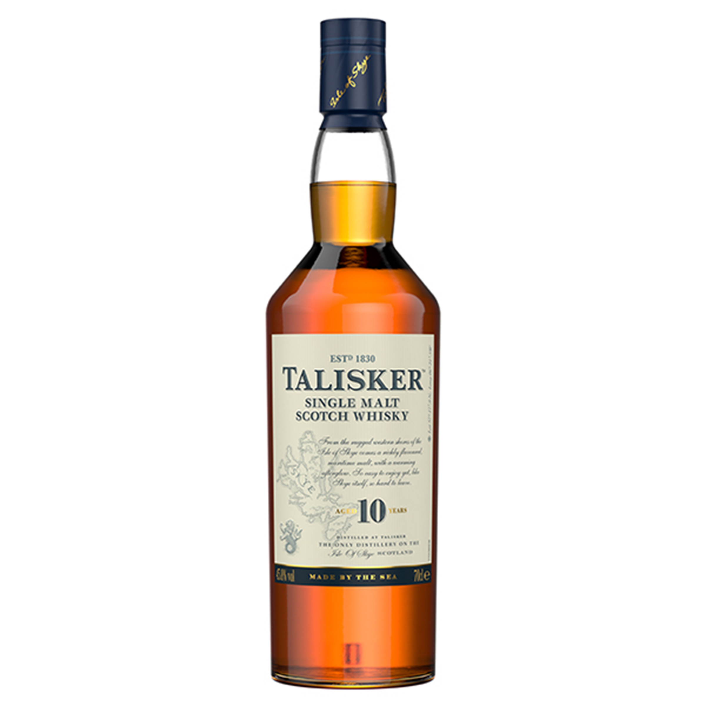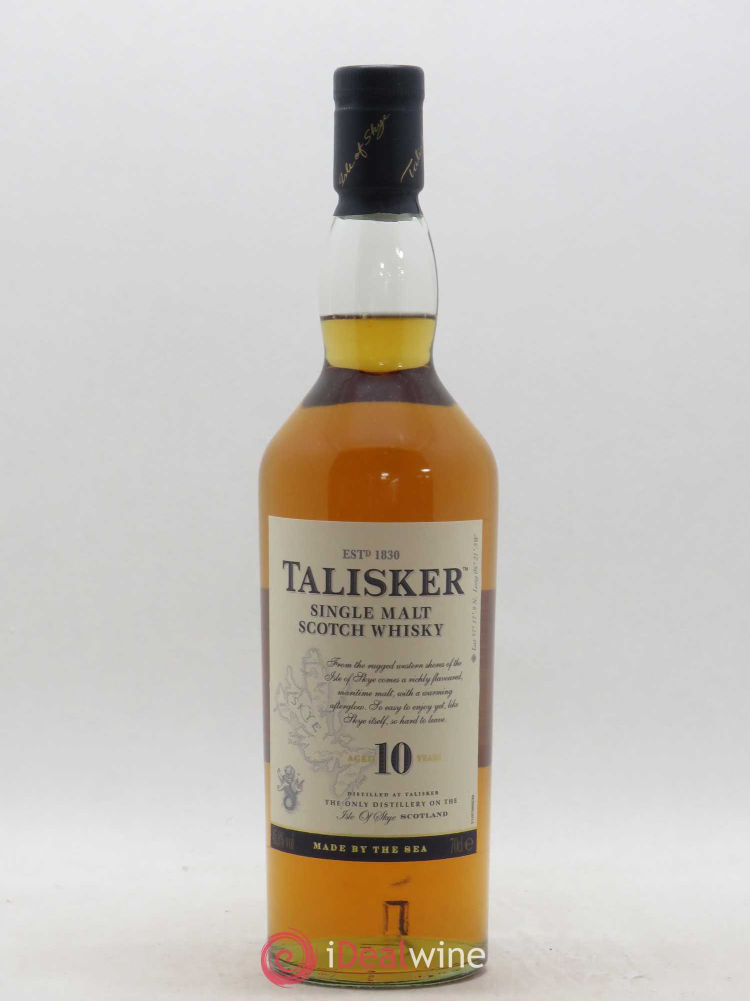 Talisker 10 Year Old Single Malt Scotch Whisky, 70cl. Produced at the oldest distillery on the Isle of Skye, Talisker Single Malt Scotch Whisky has been made by the sea since 1830, with its smell and taste instantly connecting you to its rugged maritime home. Every sip is a taste of the Isle of Skye itself, one of the most remote, windswept yet.