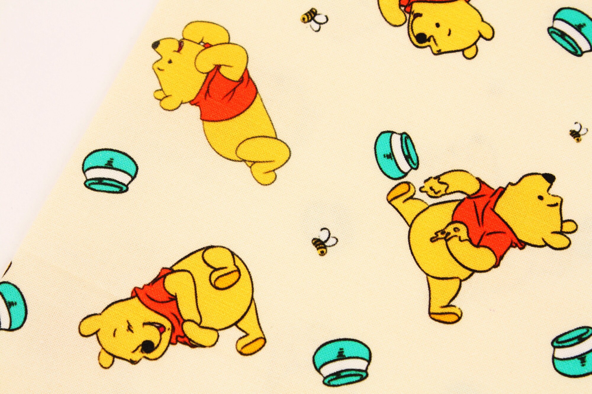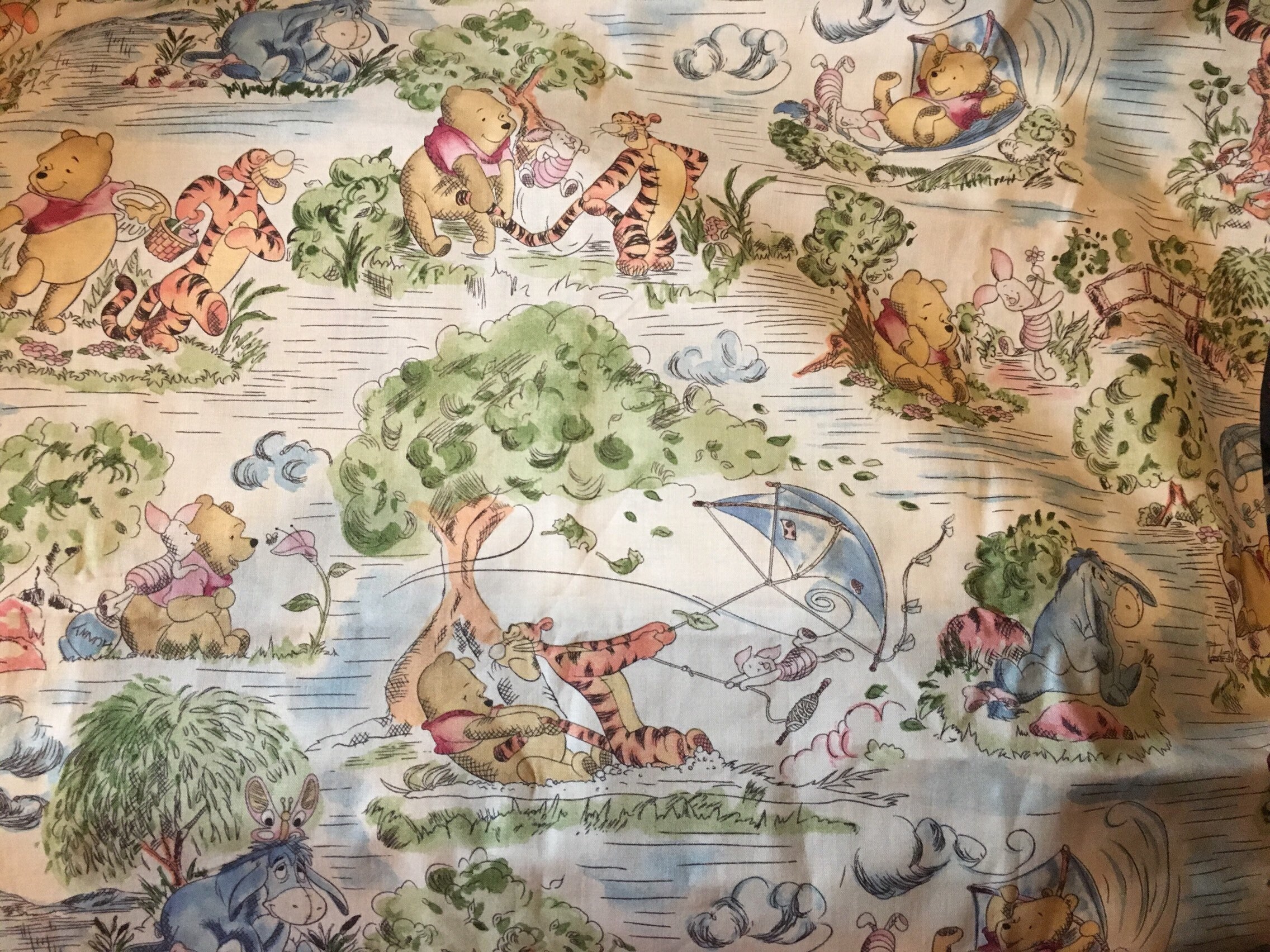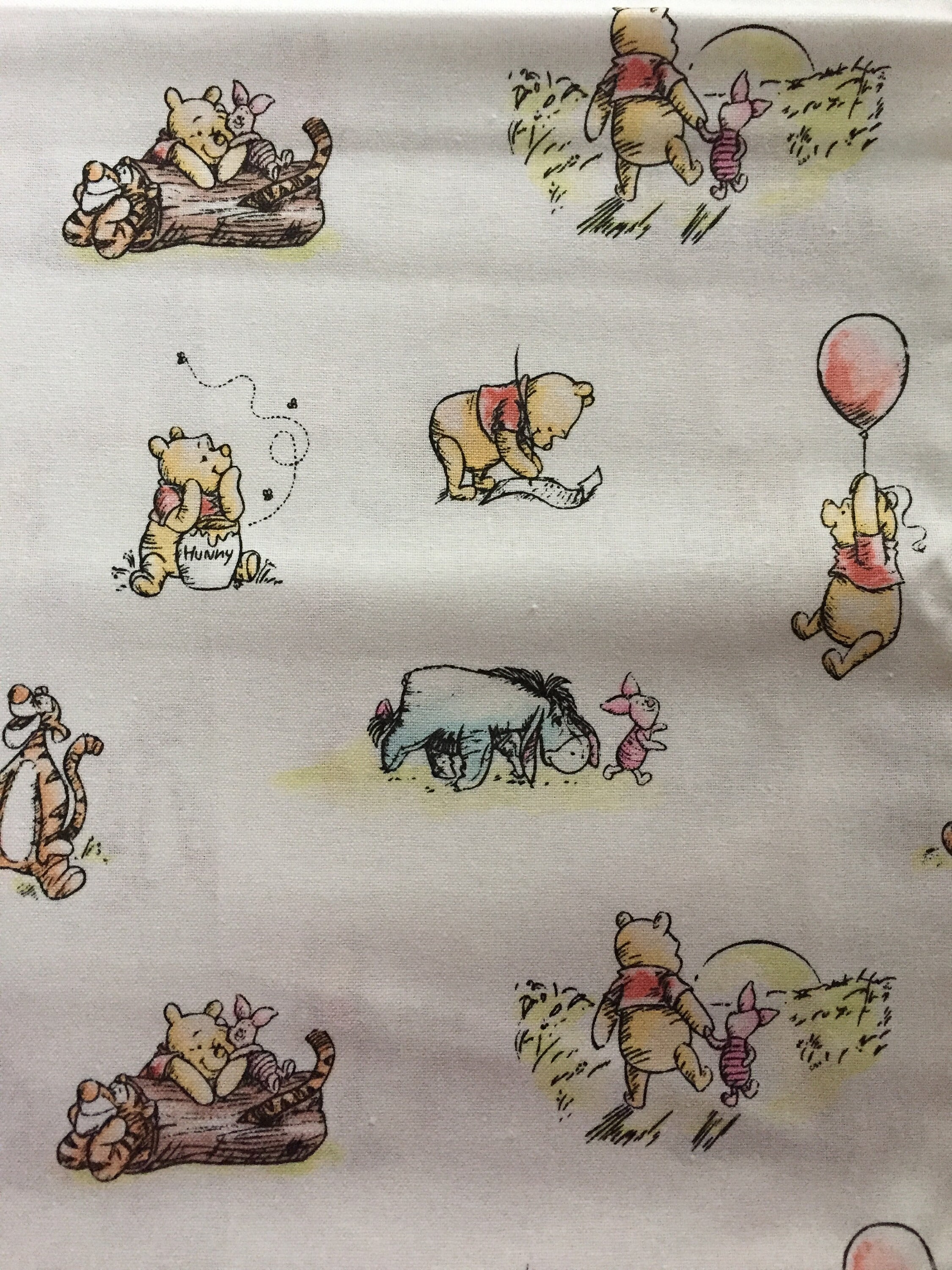 Winnie the Pooh Fabrics. Find officially licensed Winnie the Pooh fabrics from Disney! These fun patterns feature characters like Winnie himself, Tigger, Eeyore, Piglet, and others, along with fun icons like pots of hunny (honey), balloons, clouds, and kites. Choose your favorite fabric type to match your project.